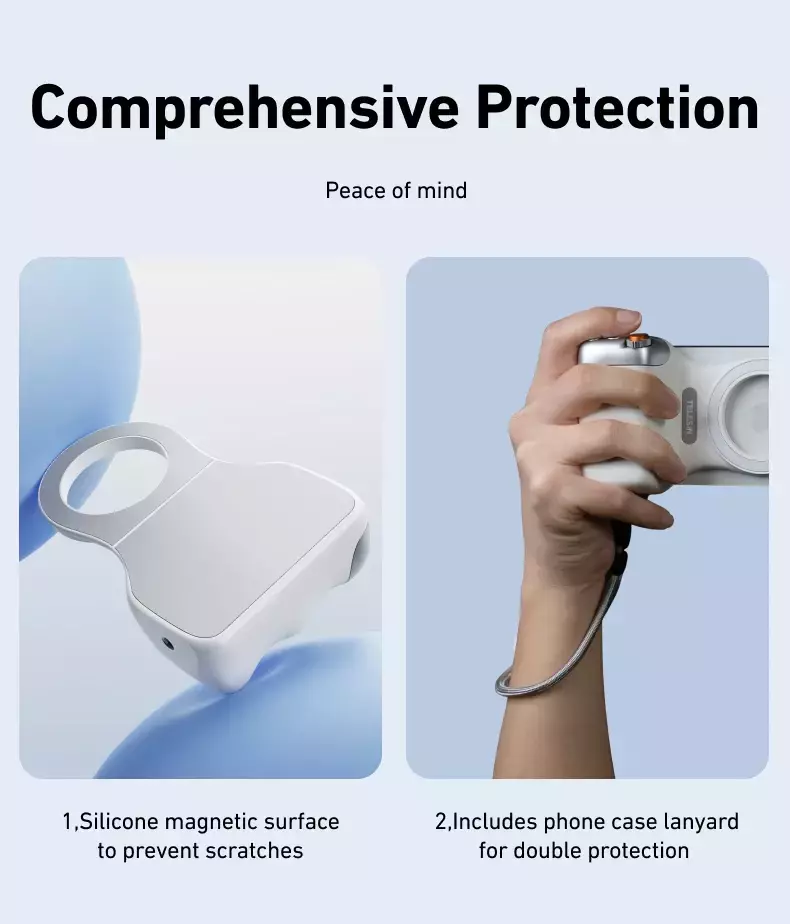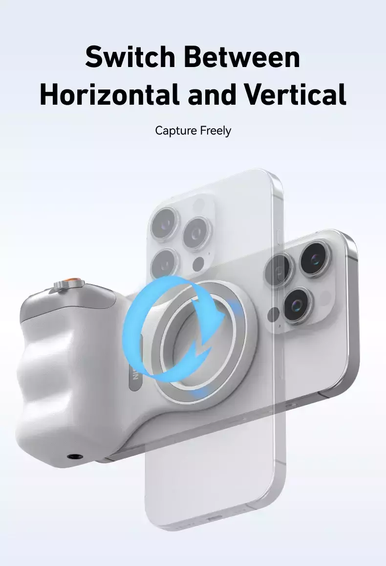 Conexão versátil: suporte magnético compatível com MagSafe ou grampo universal (50–95mm), adaptando-se a diversos smartphones.
